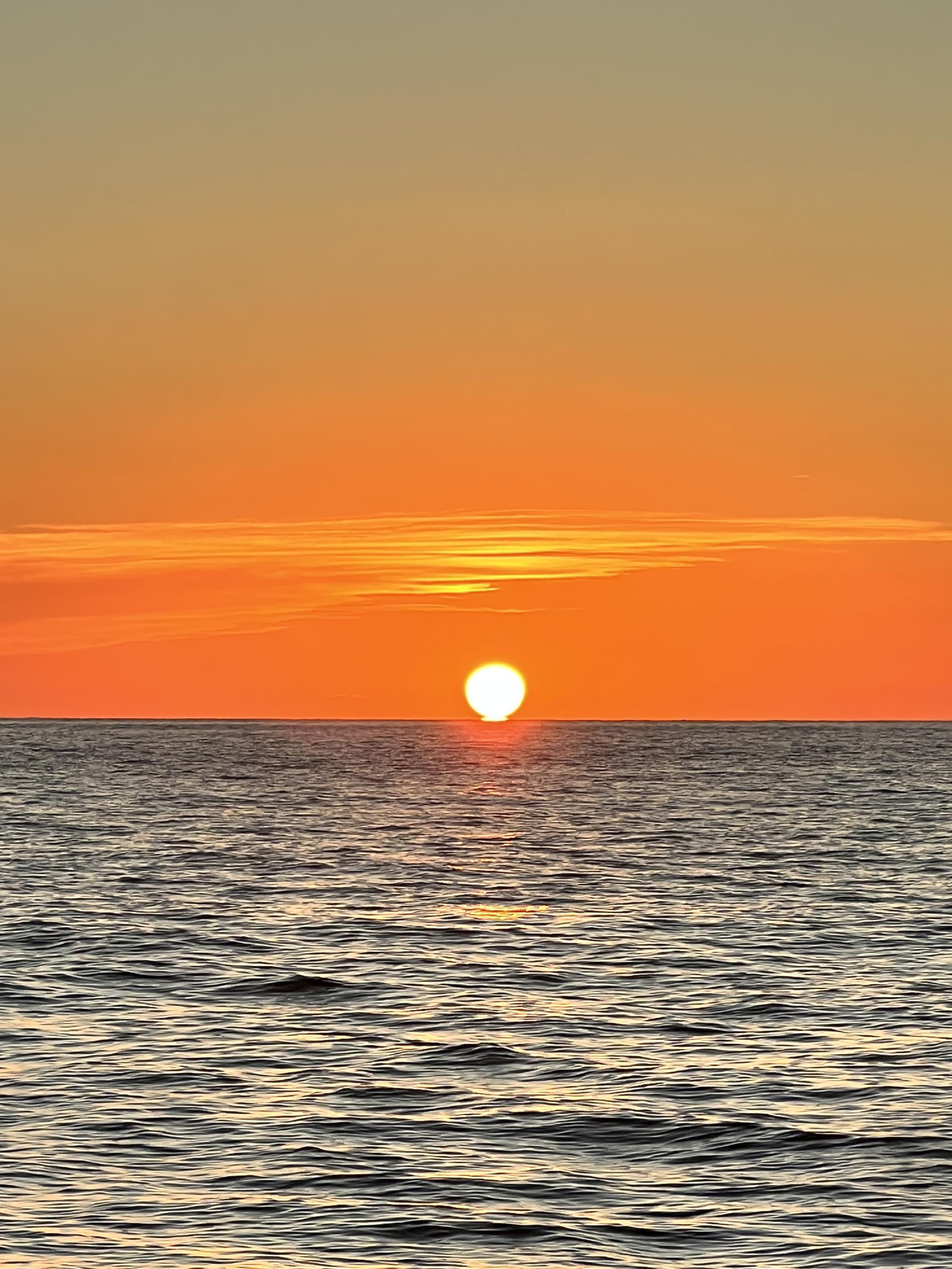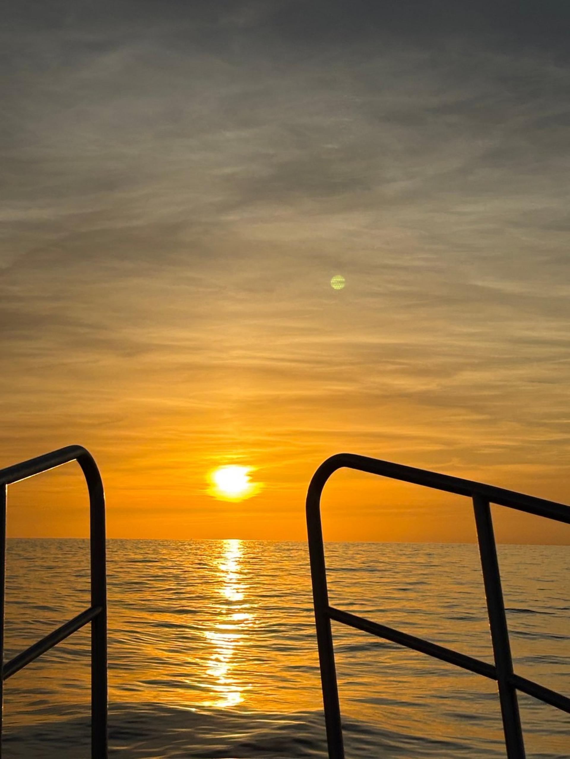 Au moment le plus spectaculaire de la soirée, nous jetterons l’ancre pour un apéritif face au soleil qui disparaît à l’horizon. Les boissons sont servies à bord : vin blanc ou rosé, eau, coca cola et jus de fruits, accompagnés de charcuterie et de pain, pour un instant convivial et authentique en mer.